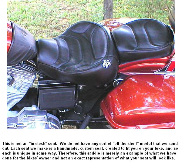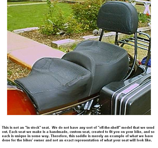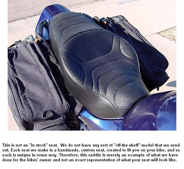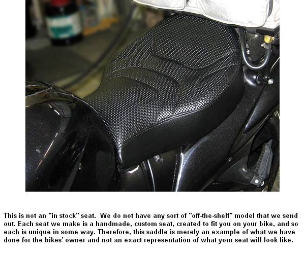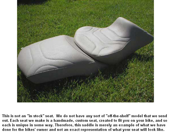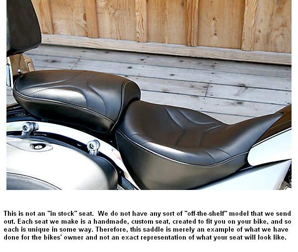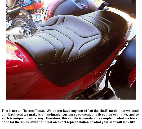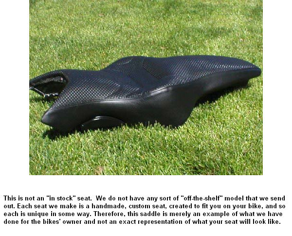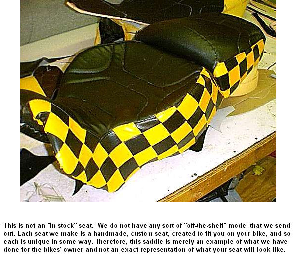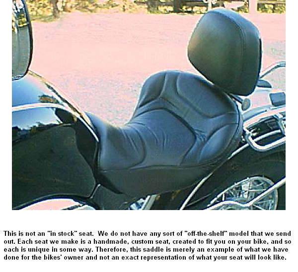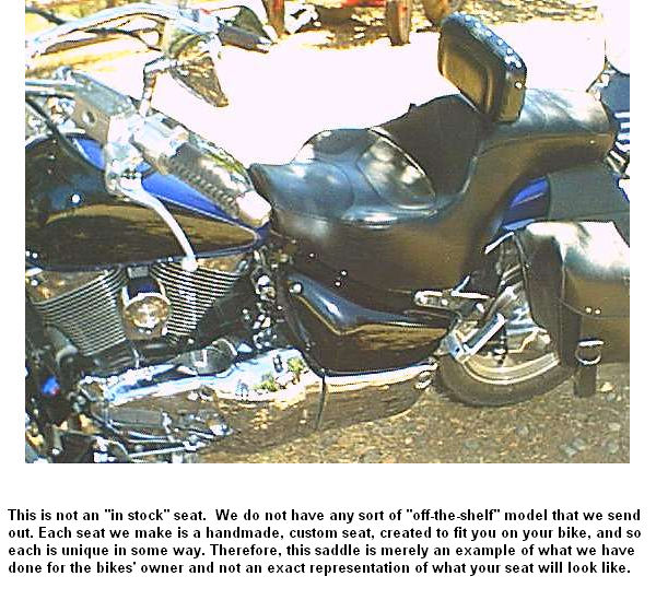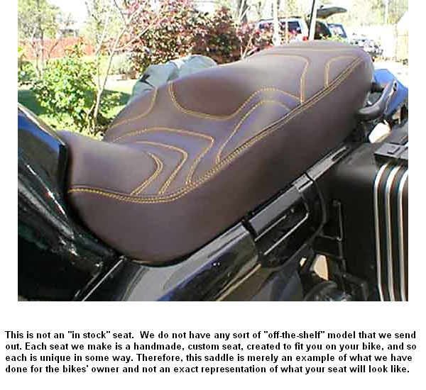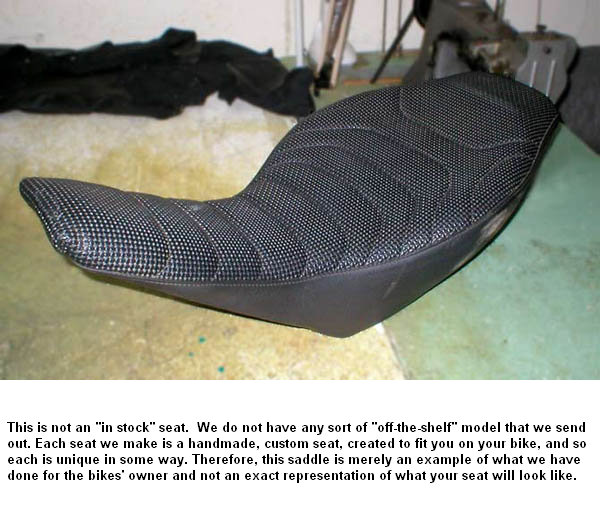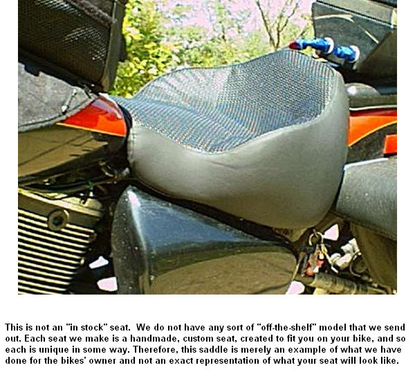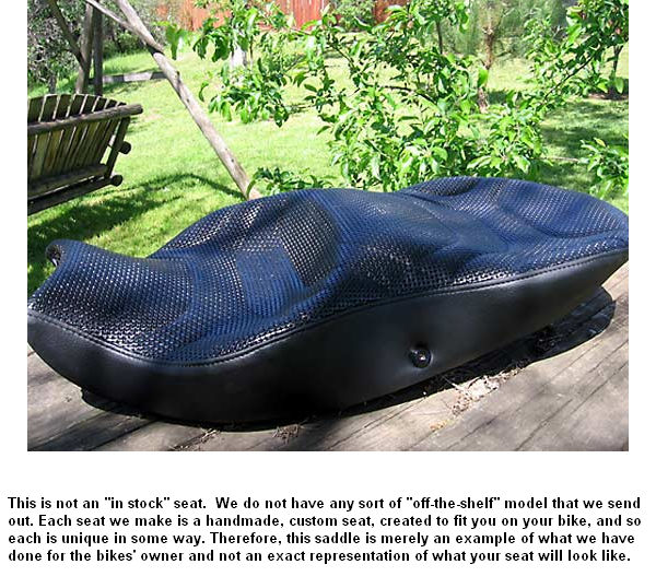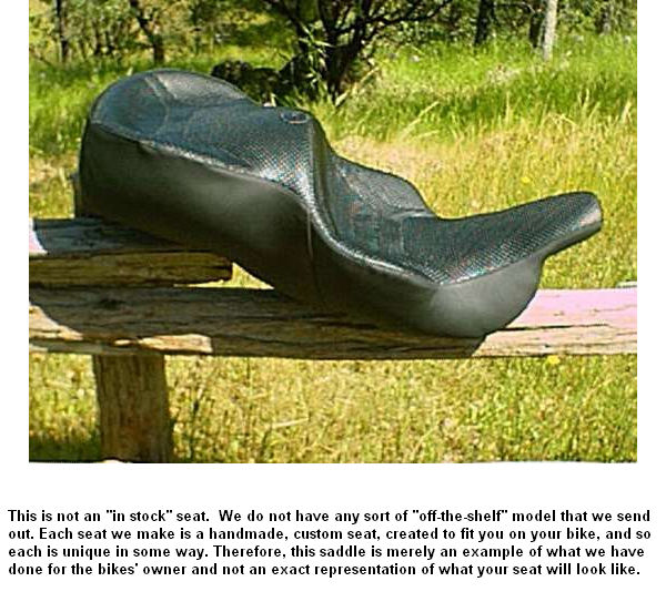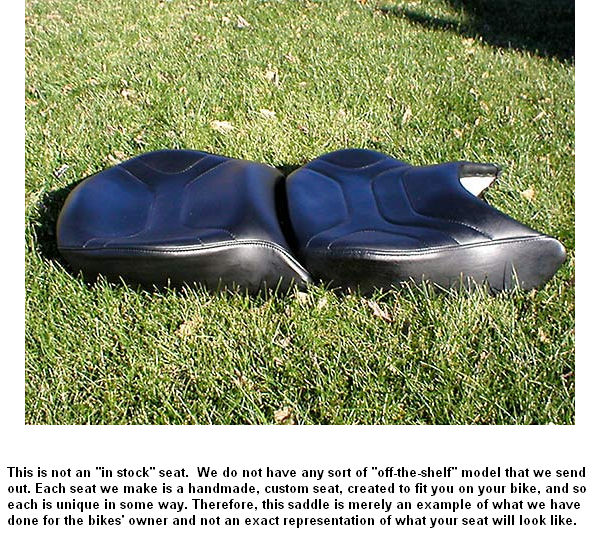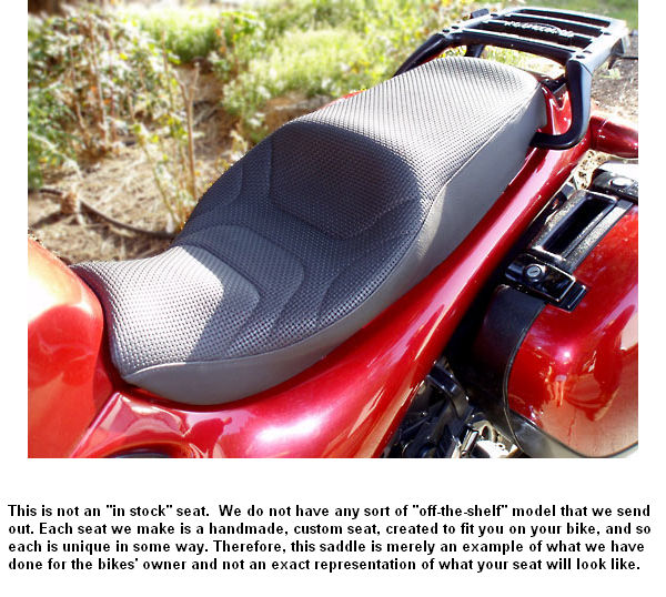 | Photo Gallery Use the menu below to view these photos of saddles made by Rick Mayer Cycle. This page is constantly being updated as new photos become available. All image links will open in a new window (or tab). Close the image window to return here. Please be aware that we make seats for any bike imaginable. For the most part, the photos listed here are from our customers who send them to us, or they are photos taken in our shop at the completion of a ride-in appointment. We always put photos online as soon as we can. This gallery represents our available stock of photos. These are not "in stock" seats. Each seat we make is a handmade, custom seat, created to fit you on your bike, and so each is unique in some way. We do not have any sort of "off-the-shelf" model that we send out. Therefore, these photos are merely examples of what we have done for the bikes' owners and not an exact representation of what your seat will look like. Note: Any seats described as "low" or "for the short rider" have been modified from stock to increase the customer's ground clearance. Please see our FAQ's (or contact Rick) for more information about this issue.