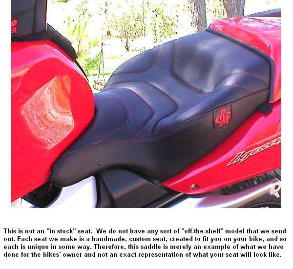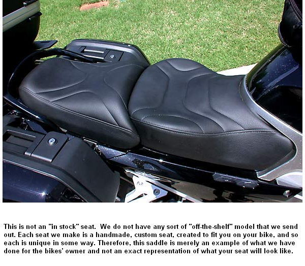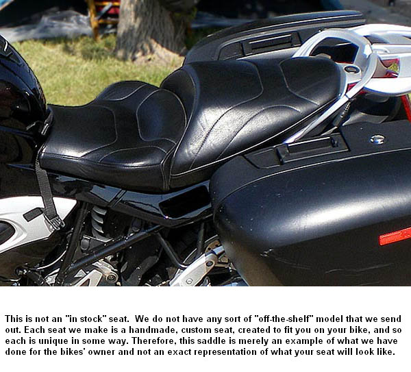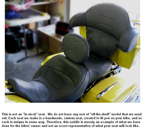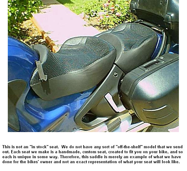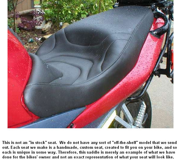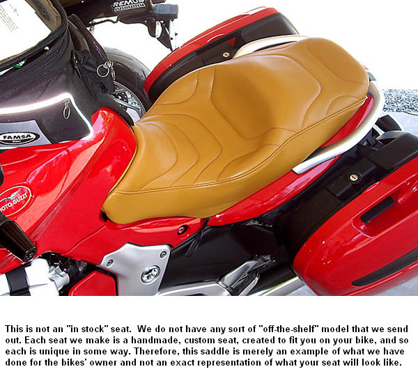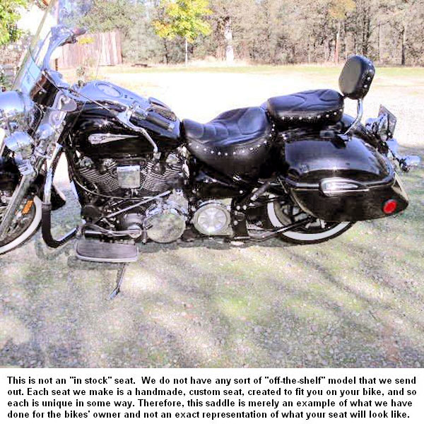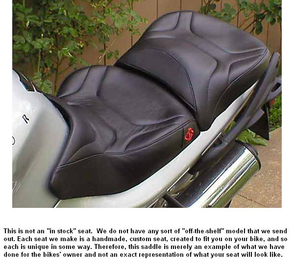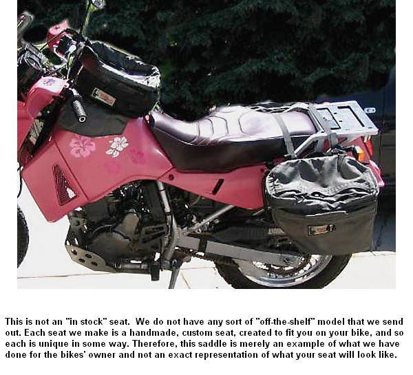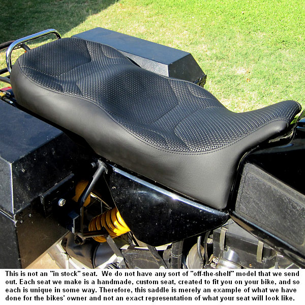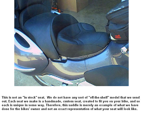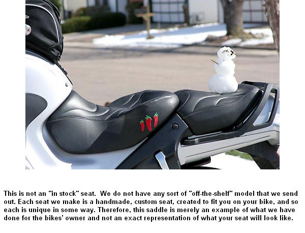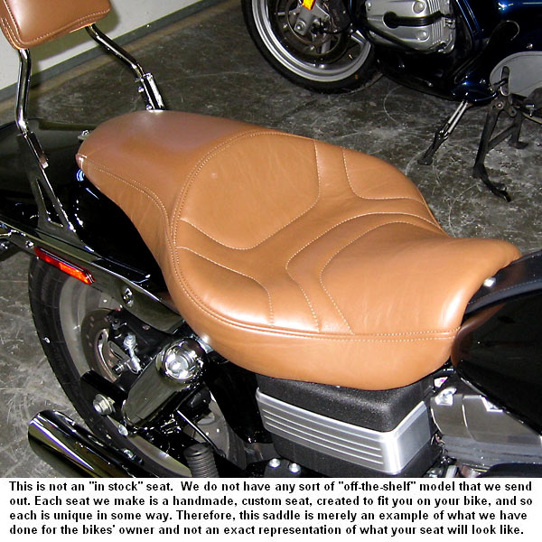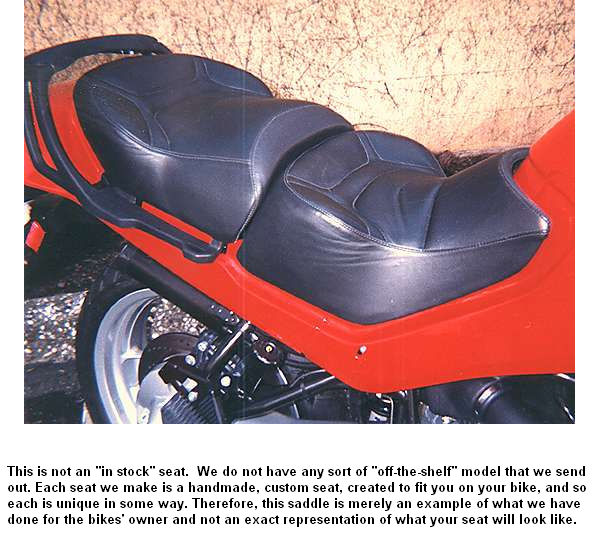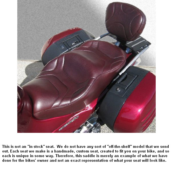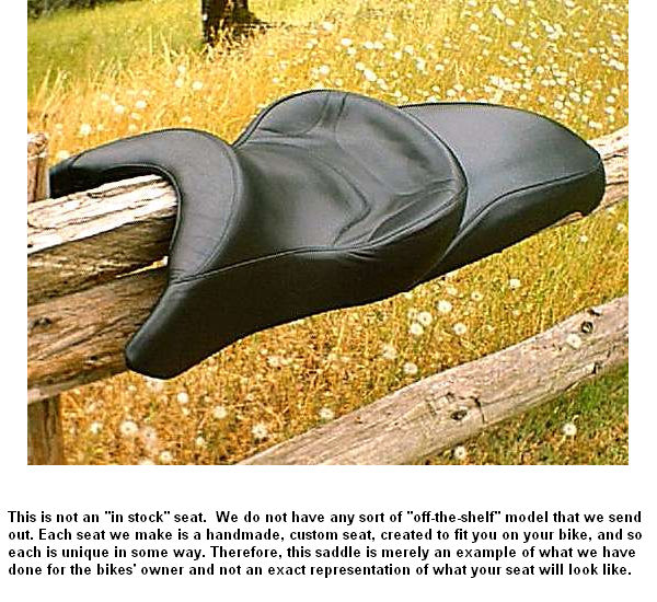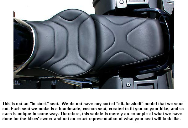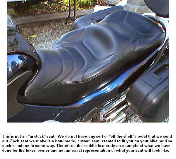 | Photo Gallery Use the menu below to view these photos of saddles made by Rick Mayer Cycle. This page is constantly being updated as new photos become available. All image links will open in a new window (or tab). Close the image window to return here. Please be aware that we make seats for any bike imaginable. For the most part, the photos listed here are from our customers who send them to us, or they are photos taken in our shop at the completion of a ride-in appointment. We always put photos online as soon as we can. This gallery represents our available stock of photos. These are not "in stock" seats. Each seat we make is a handmade, custom seat, created to fit you on your bike, and so each is unique in some way. We do not have any sort of "off-the-shelf" model that we send out. Therefore, these photos are merely examples of what we have done for the bikes' owners and not an exact representation of what your seat will look like. Note: Any seats described as "low" or "for the short rider" have been modified from stock to increase the customer's ground clearance. Please see our FAQ's (or contact Rick) for more information about this issue.