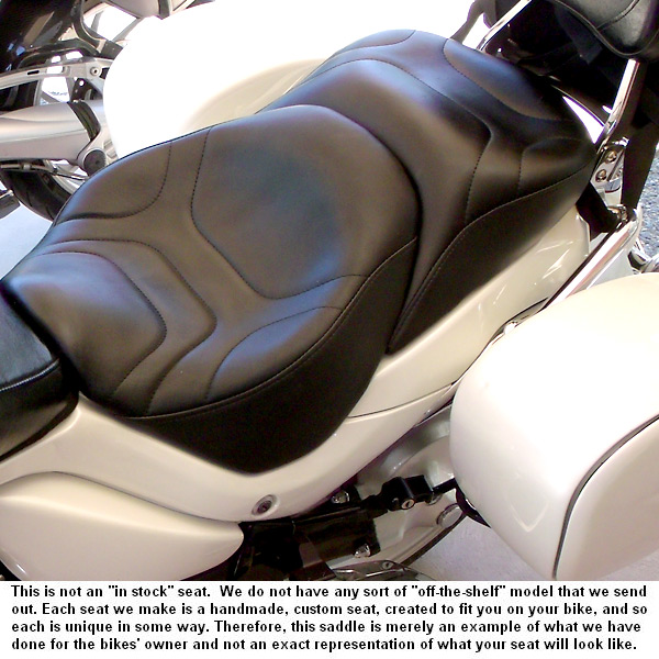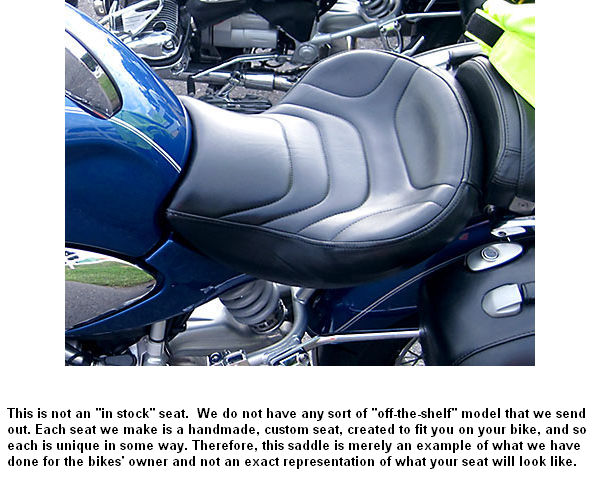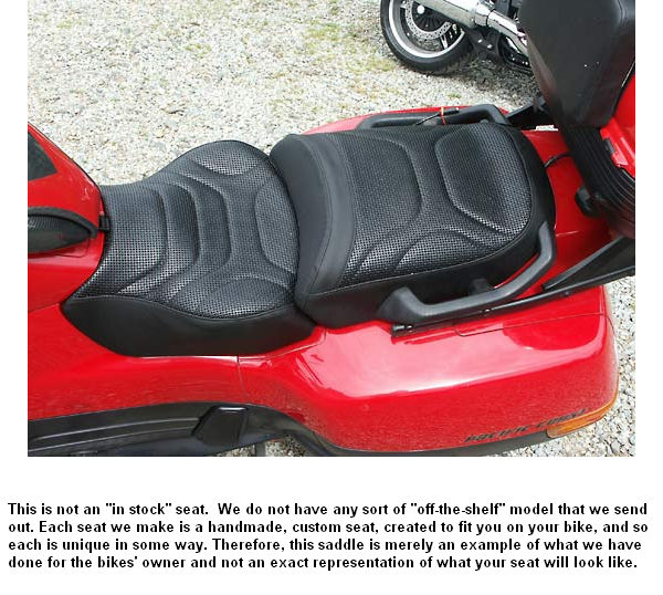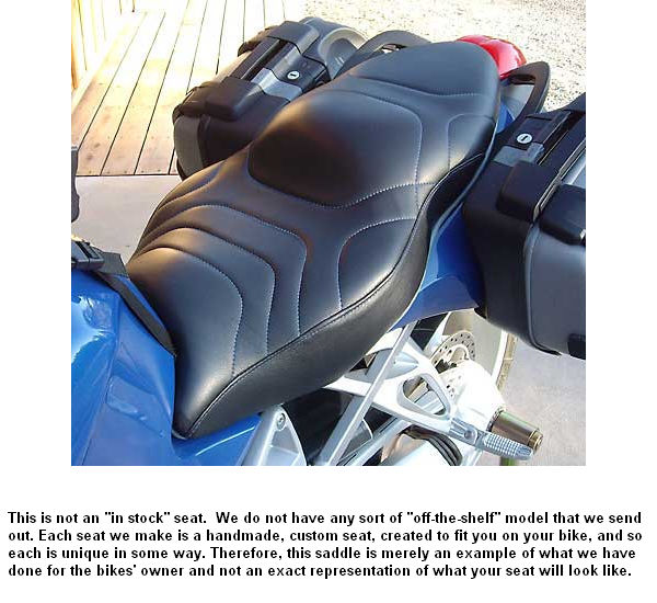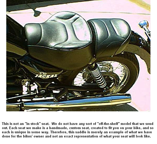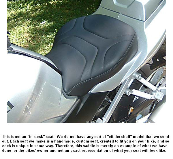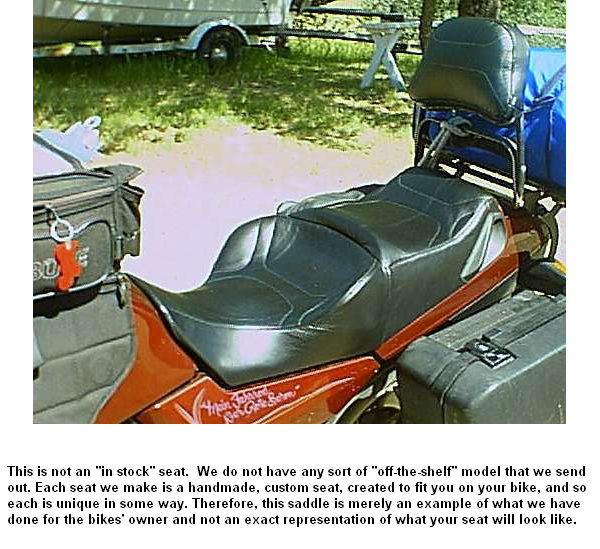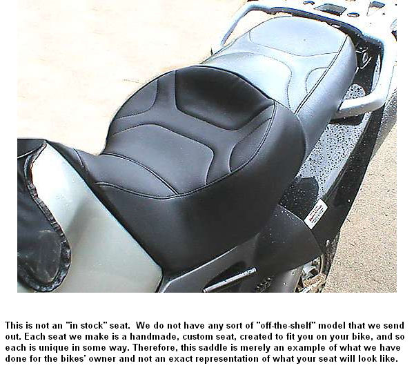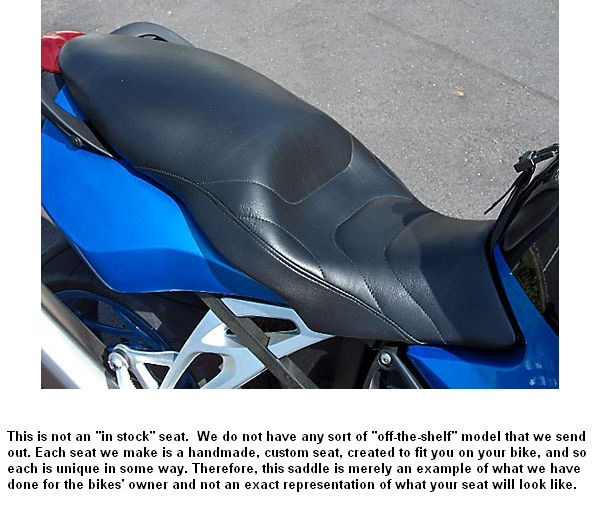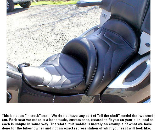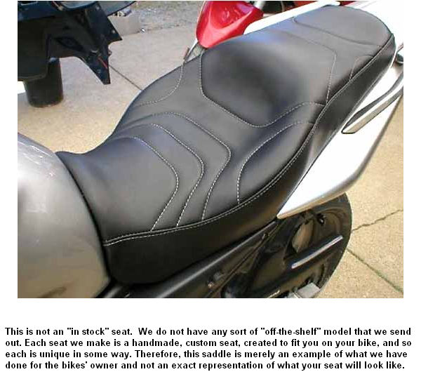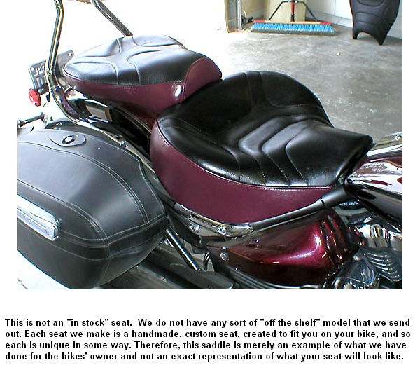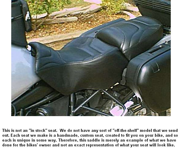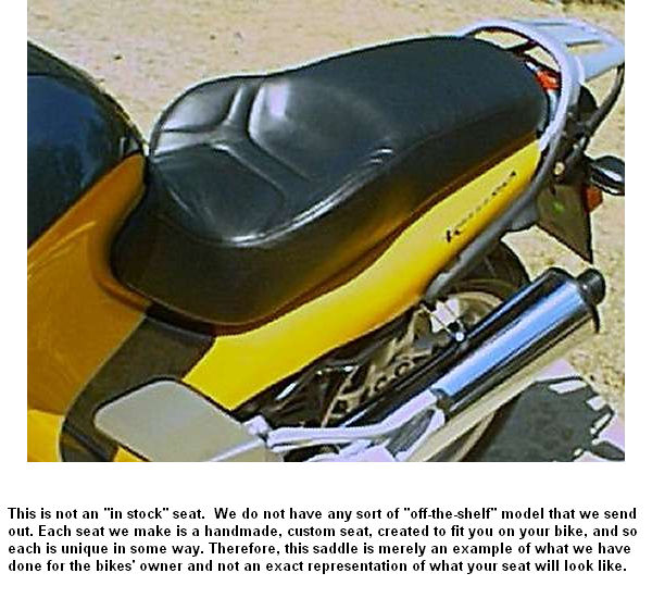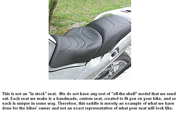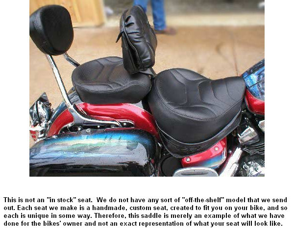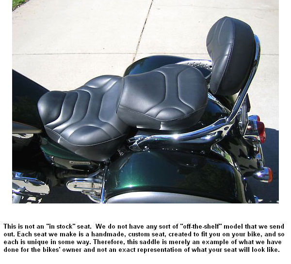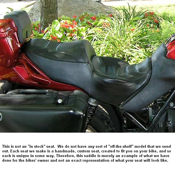 | Photo Gallery Use the menu below to view these photos of saddles made by Rick Mayer Cycle. This page is constantly being updated as new photos become available. All image links will open in a new window (or tab). Close the image window to return here. Please be aware that we make seats for any bike imaginable. For the most part, the photos listed here are from our customers who send them to us, or they are photos taken in our shop at the completion of a ride-in appointment. We always put photos online as soon as we can. This gallery represents our available stock of photos. These are not "in stock" seats. Each seat we make is a handmade, custom seat, created to fit you on your bike, and so each is unique in some way. We do not have any sort of "off-the-shelf" model that we send out. Therefore, these photos are merely examples of what we have done for the bikes' owners and not an exact representation of what your seat will look like. Note: Any seats described as "low" or "for the short rider" have been modified from stock to increase the customer's ground clearance. Please see our FAQ's (or contact Rick) for more information about this issue.