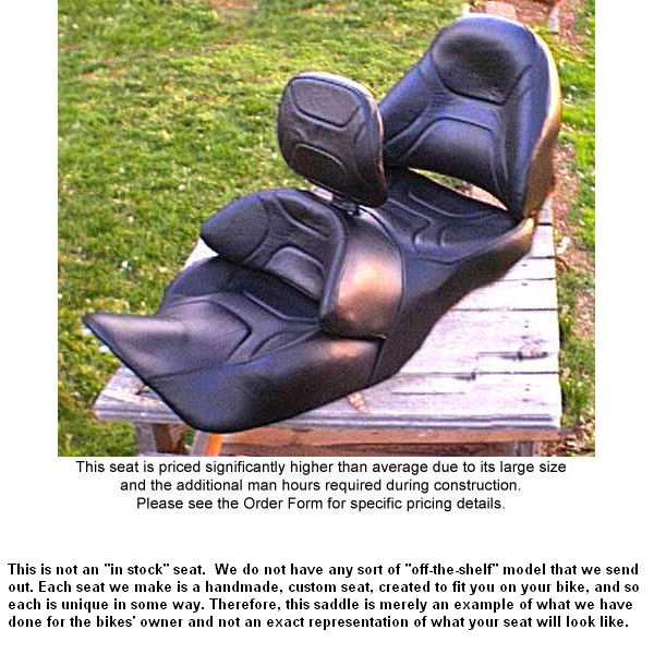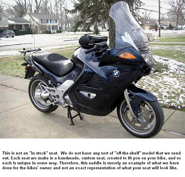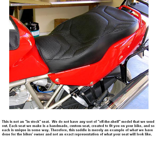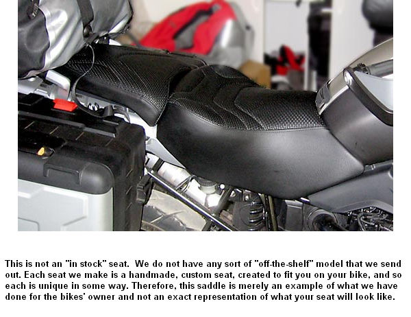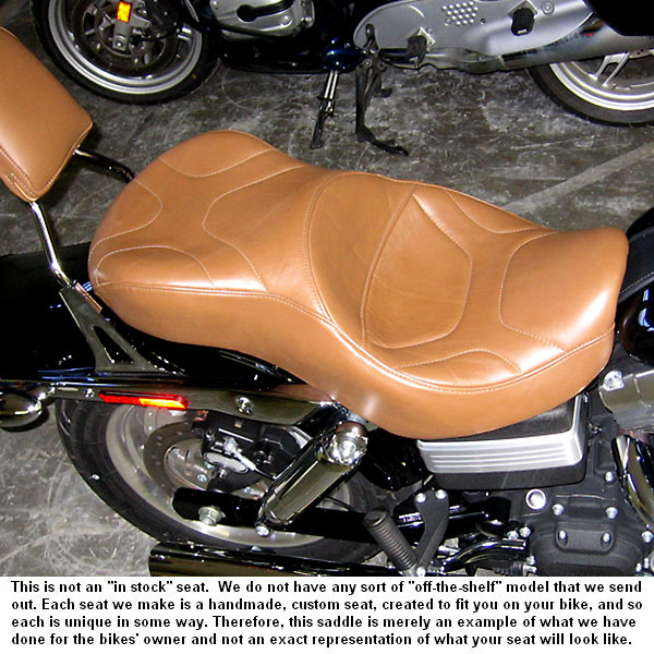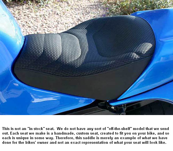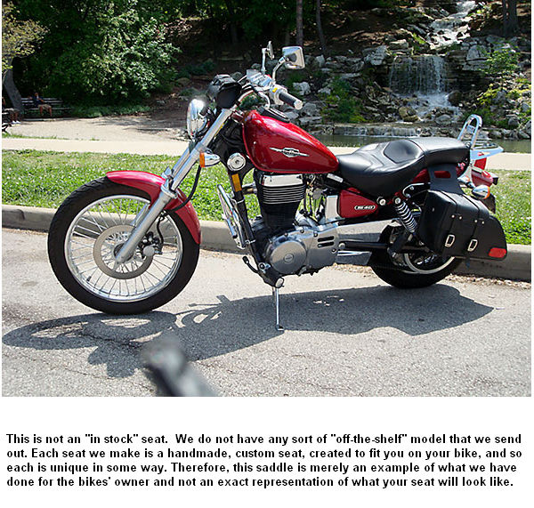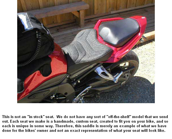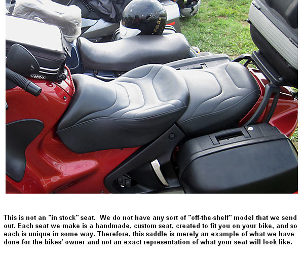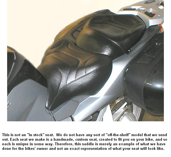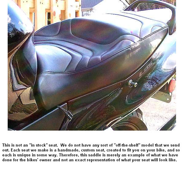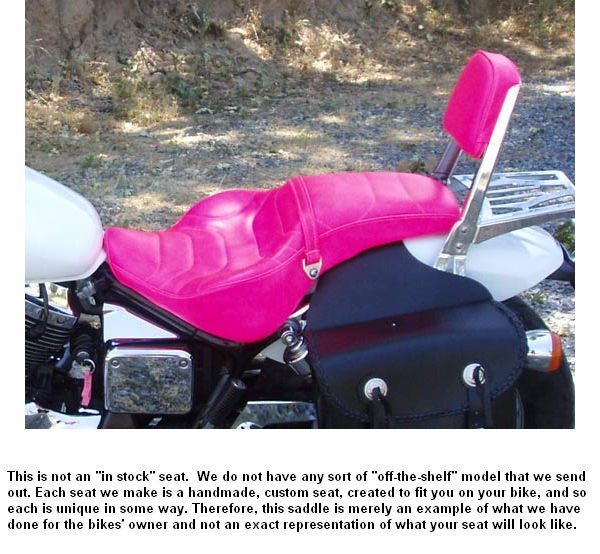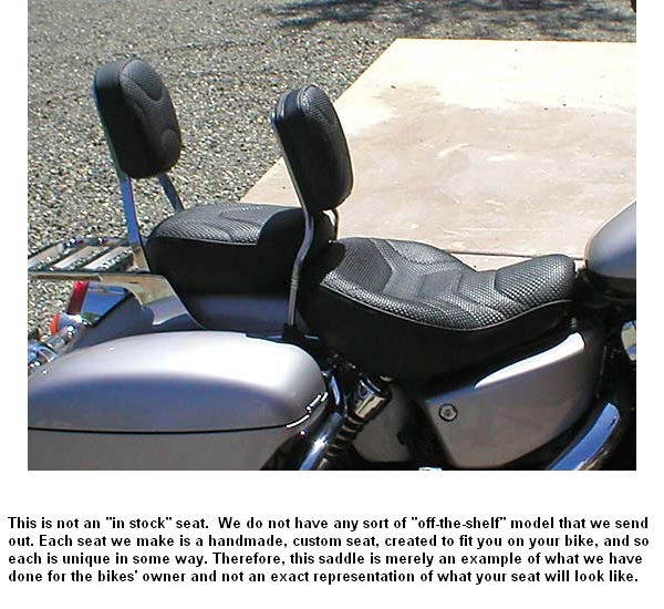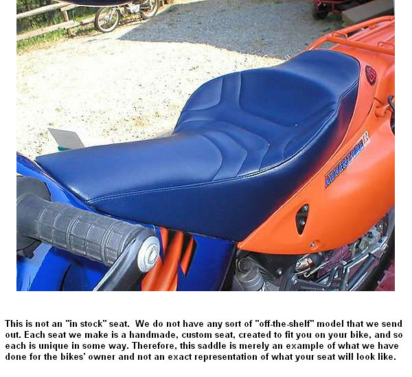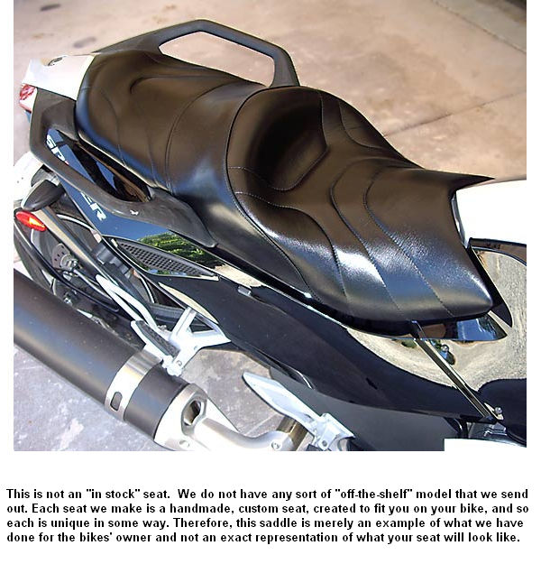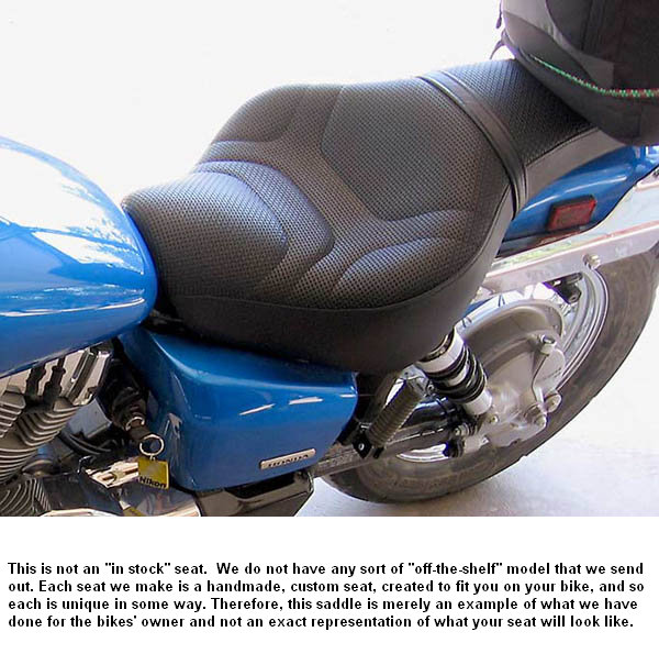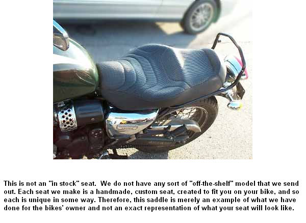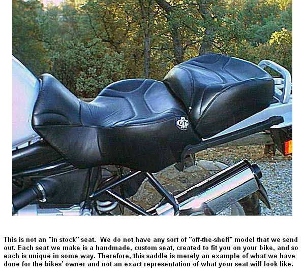 | Photo Gallery Use the menu below to view these photos of saddles made by Rick Mayer Cycle. This page is constantly being updated as new photos become available. All image links will open in a new window (or tab). Close the image window to return here. Please be aware that we make seats for any bike imaginable. For the most part, the photos listed here are from our customers who send them to us, or they are photos taken in our shop at the completion of a ride-in appointment. We always put photos online as soon as we can. This gallery represents our available stock of photos. These are not "in stock" seats. Each seat we make is a handmade, custom seat, created to fit you on your bike, and so each is unique in some way. We do not have any sort of "off-the-shelf" model that we send out. Therefore, these photos are merely examples of what we have done for the bikes' owners and not an exact representation of what your seat will look like. Note: Any seats described as "low" or "for the short rider" have been modified from stock to increase the customer's ground clearance. Please see our FAQ's (or contact Rick) for more information about this issue.