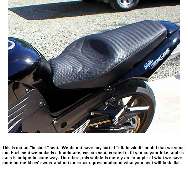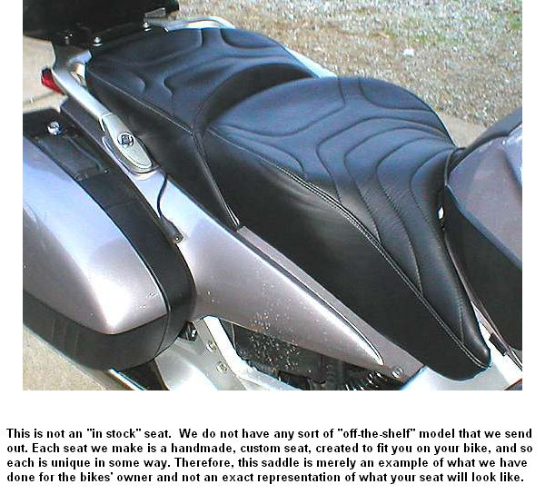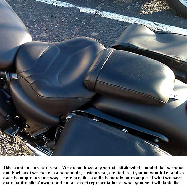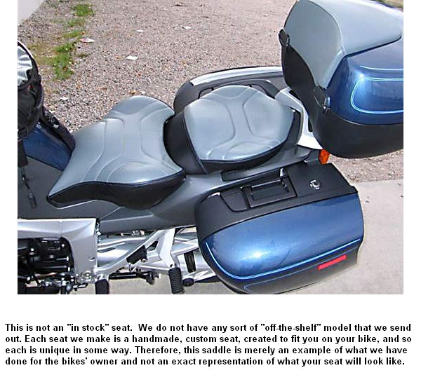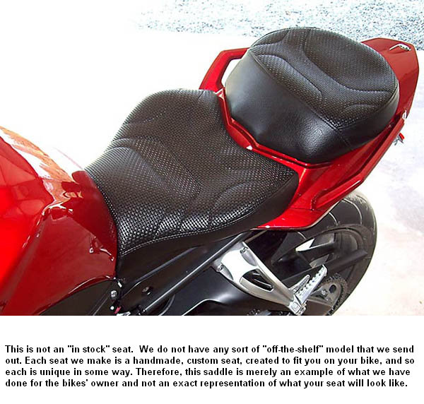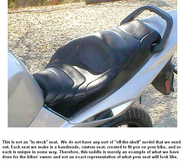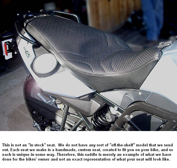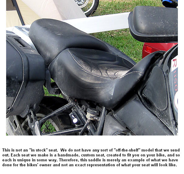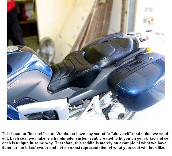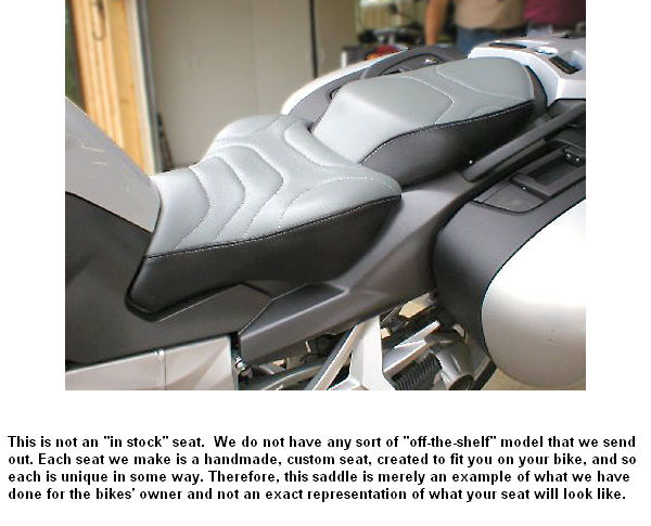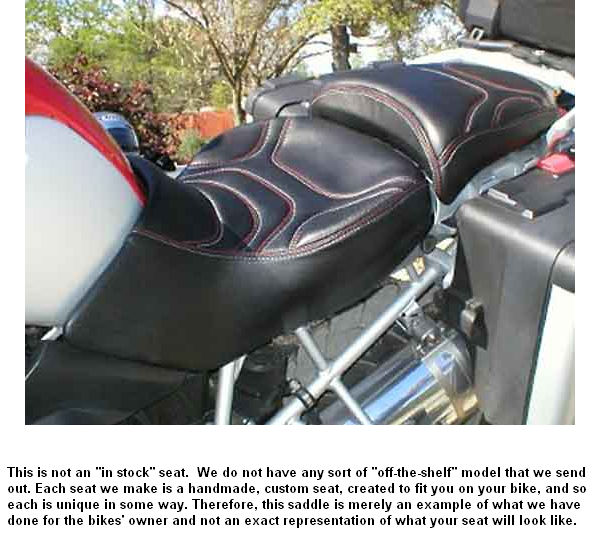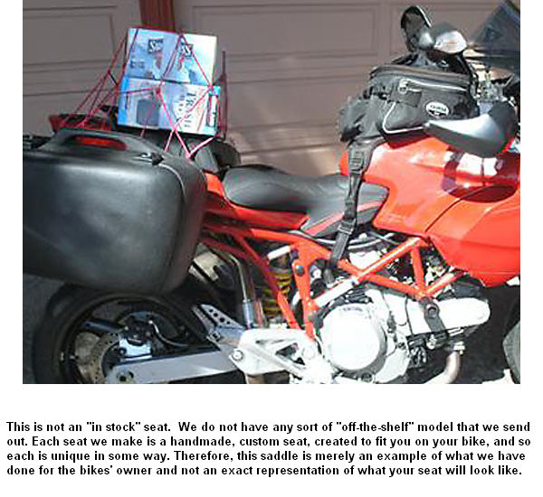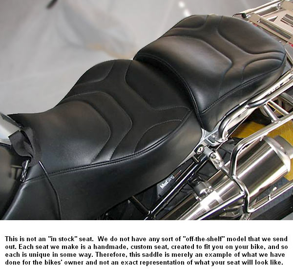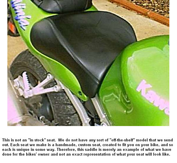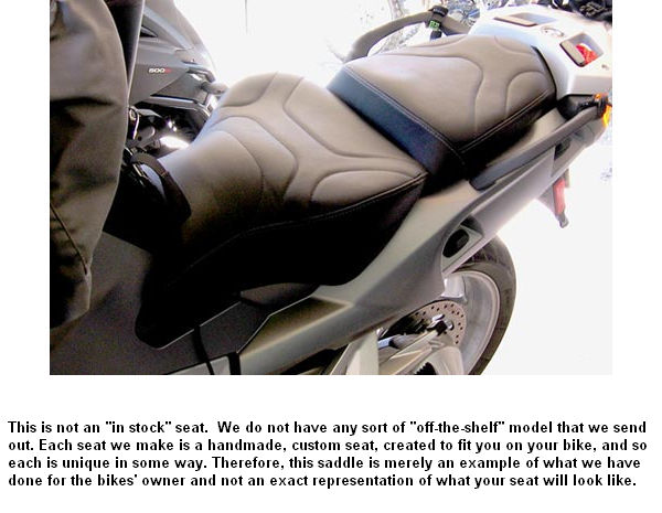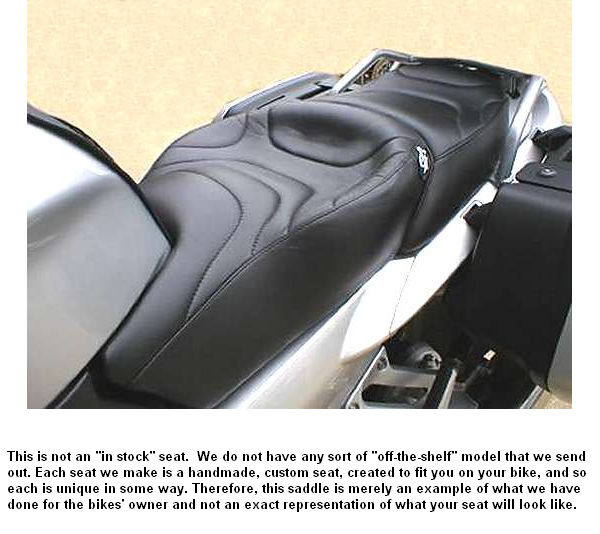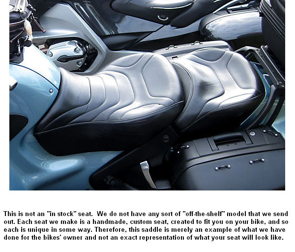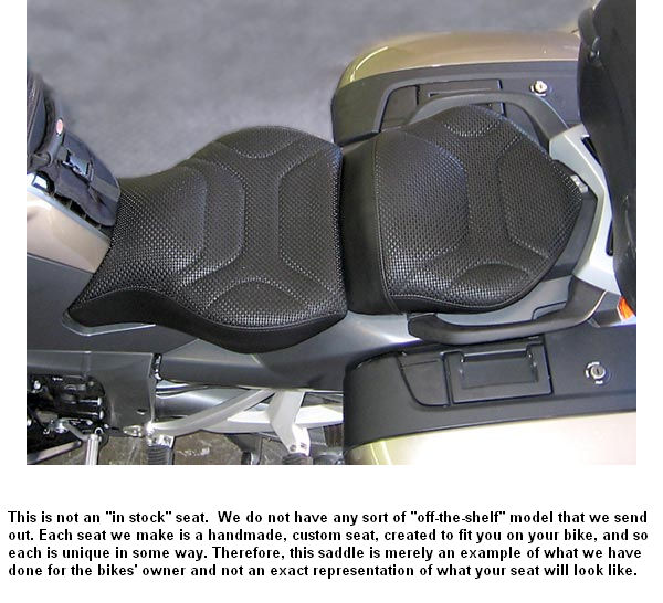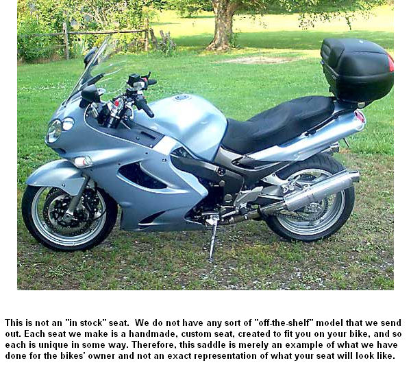 | Photo Gallery Use the menu below to view these photos of saddles made by Rick Mayer Cycle. This page is constantly being updated as new photos become available. All image links will open in a new window (or tab). Close the image window to return here. Please be aware that we make seats for any bike imaginable. For the most part, the photos listed here are from our customers who send them to us, or they are photos taken in our shop at the completion of a ride-in appointment. We always put photos online as soon as we can. This gallery represents our available stock of photos. These are not "in stock" seats. Each seat we make is a handmade, custom seat, created to fit you on your bike, and so each is unique in some way. We do not have any sort of "off-the-shelf" model that we send out. Therefore, these photos are merely examples of what we have done for the bikes' owners and not an exact representation of what your seat will look like. Note: Any seats described as "low" or "for the short rider" have been modified from stock to increase the customer's ground clearance. Please see our FAQ's (or contact Rick) for more information about this issue.