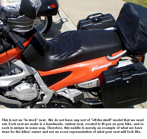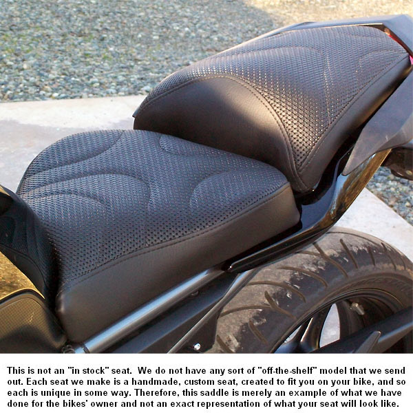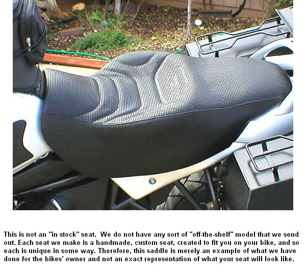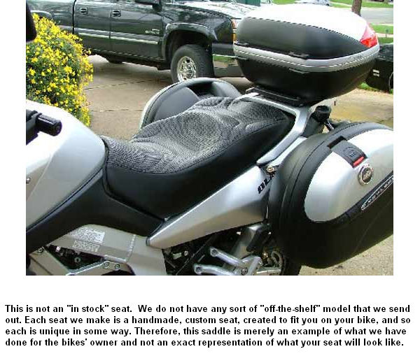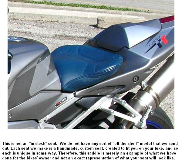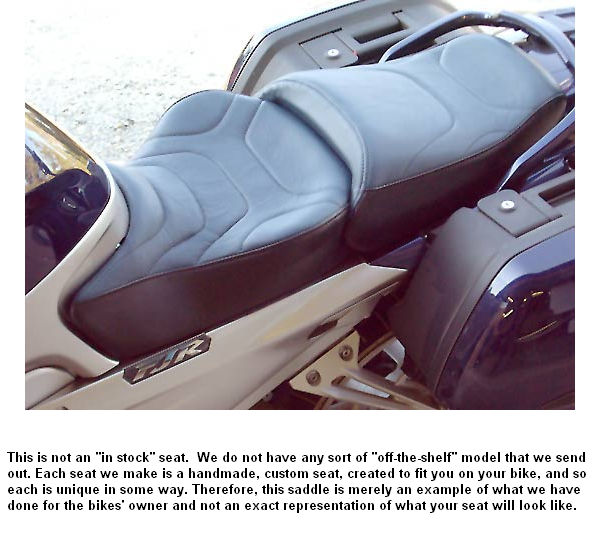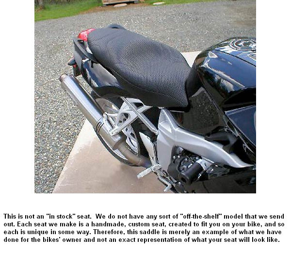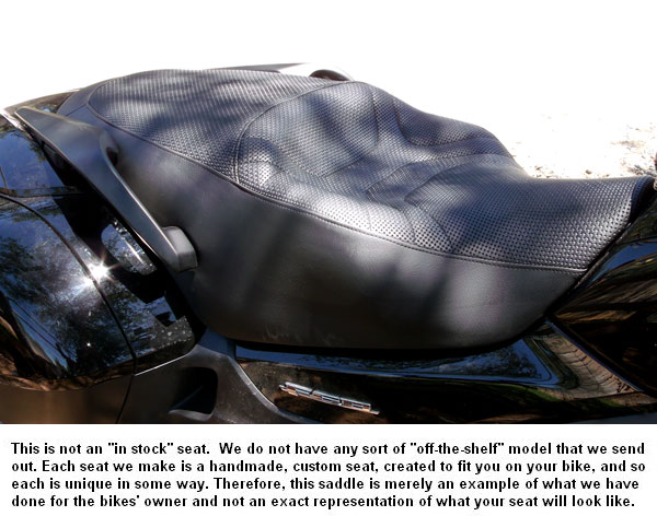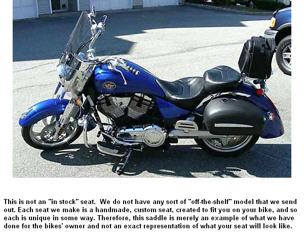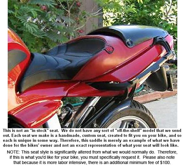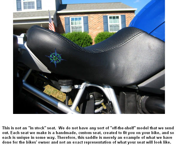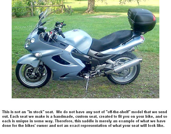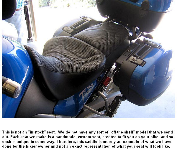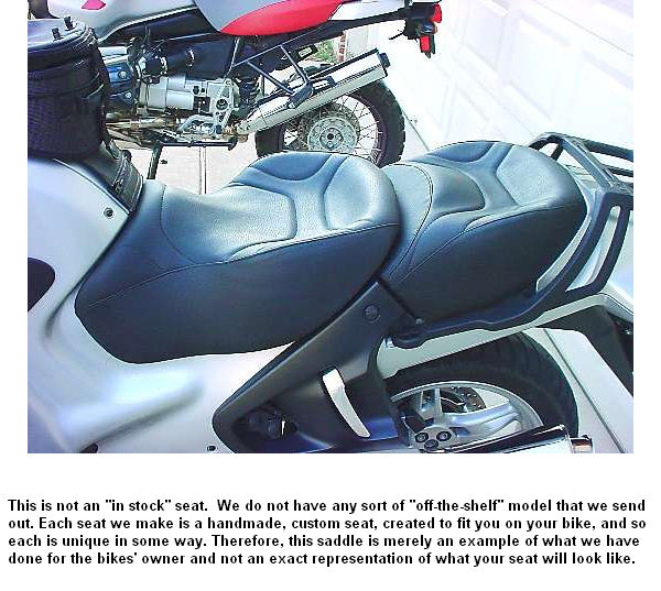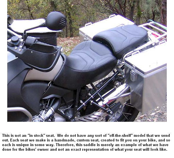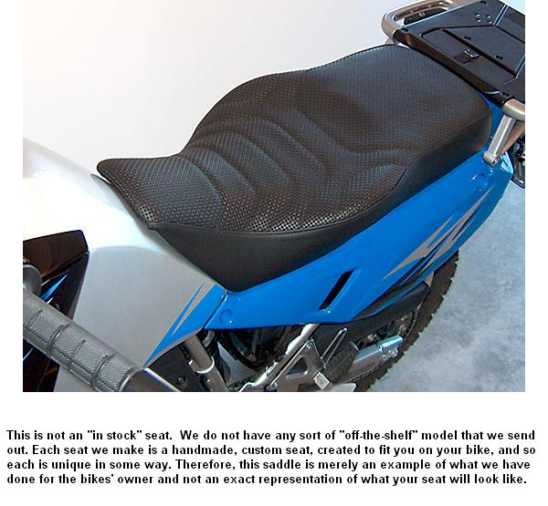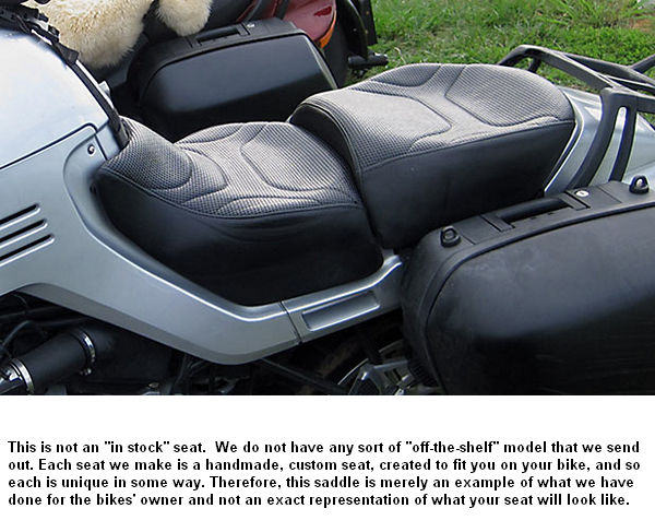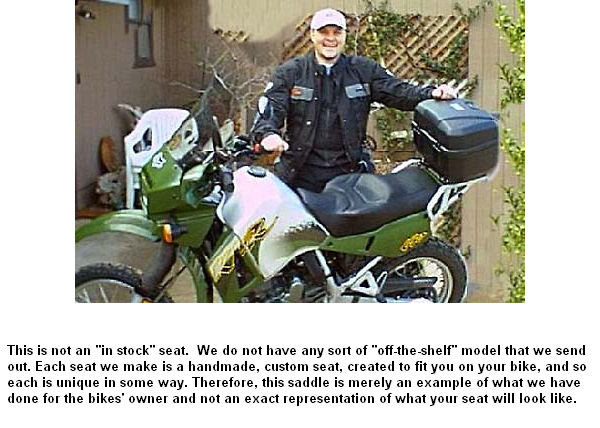 | Photo Gallery Use the menu below to view these photos of saddles made by Rick Mayer Cycle. This page is constantly being updated as new photos become available. All image links will open in a new window (or tab). Close the image window to return here. Please be aware that we make seats for any bike imaginable. For the most part, the photos listed here are from our customers who send them to us, or they are photos taken in our shop at the completion of a ride-in appointment. We always put photos online as soon as we can. This gallery represents our available stock of photos. These are not "in stock" seats. Each seat we make is a handmade, custom seat, created to fit you on your bike, and so each is unique in some way. We do not have any sort of "off-the-shelf" model that we send out. Therefore, these photos are merely examples of what we have done for the bikes' owners and not an exact representation of what your seat will look like. Note: Any seats described as "low" or "for the short rider" have been modified from stock to increase the customer's ground clearance. Please see our FAQ's (or contact Rick) for more information about this issue.