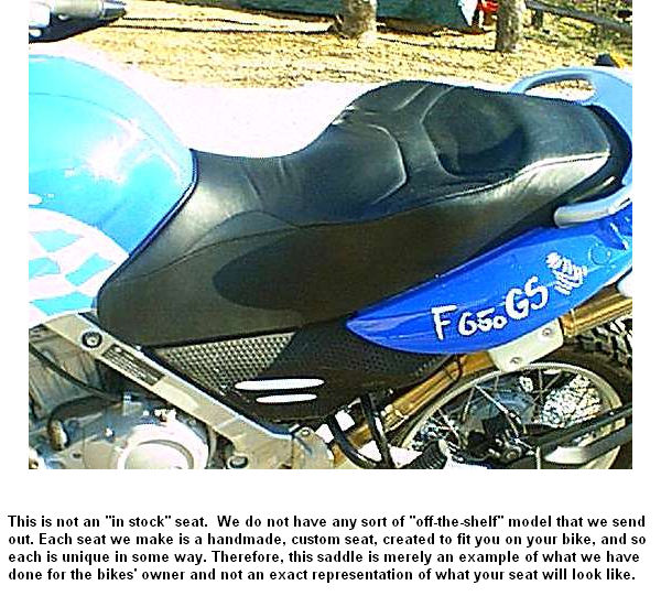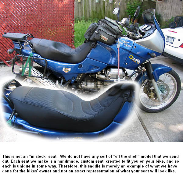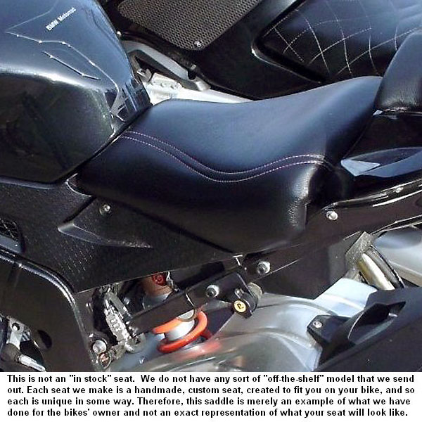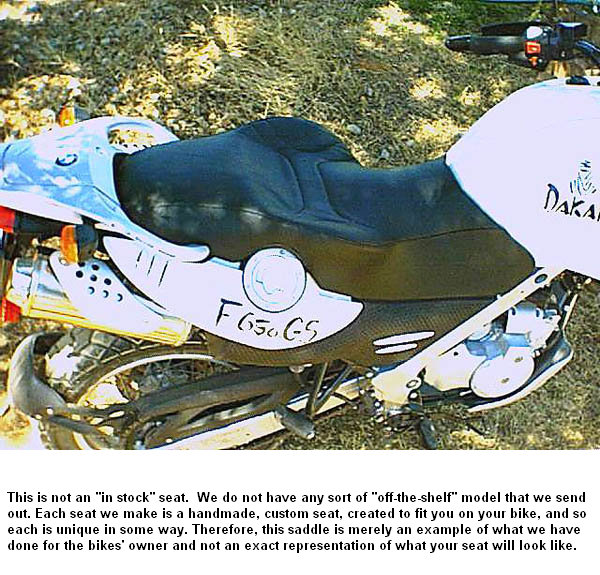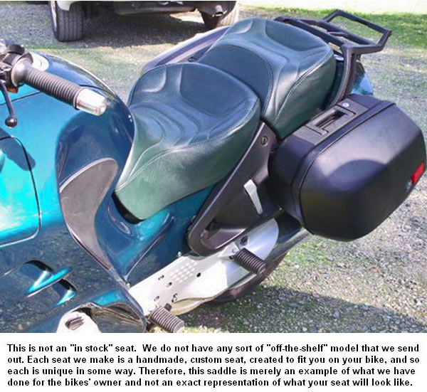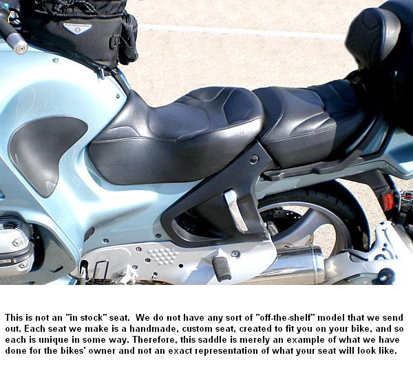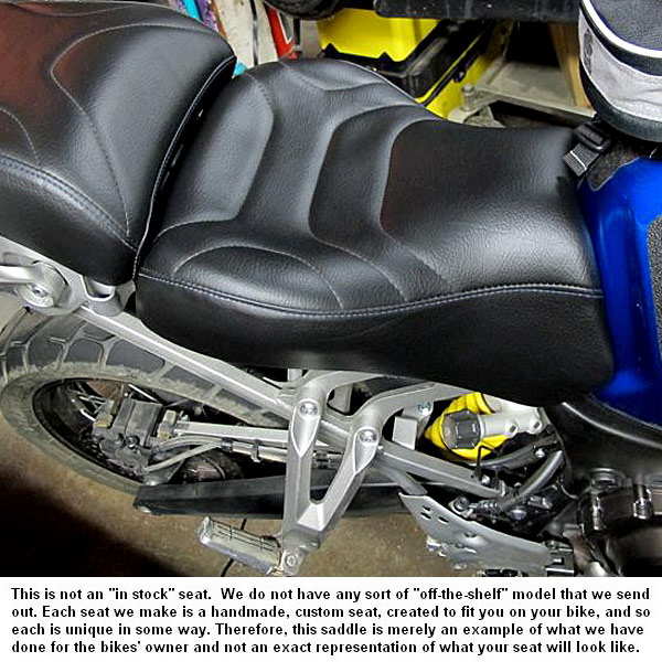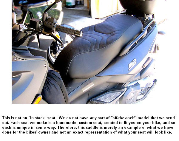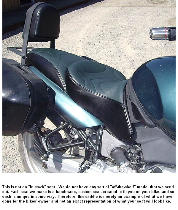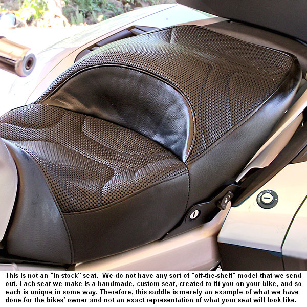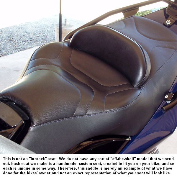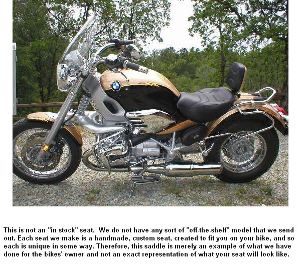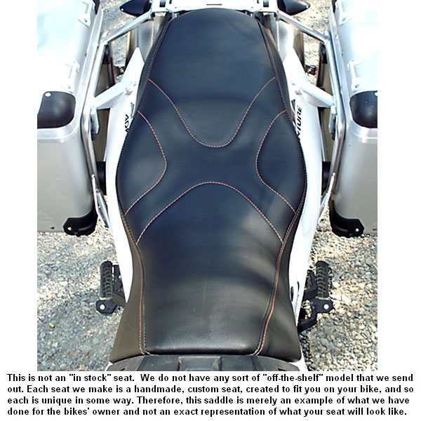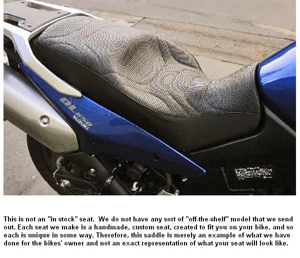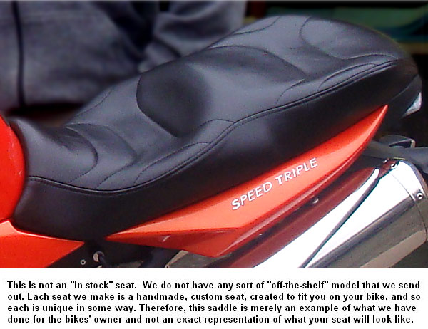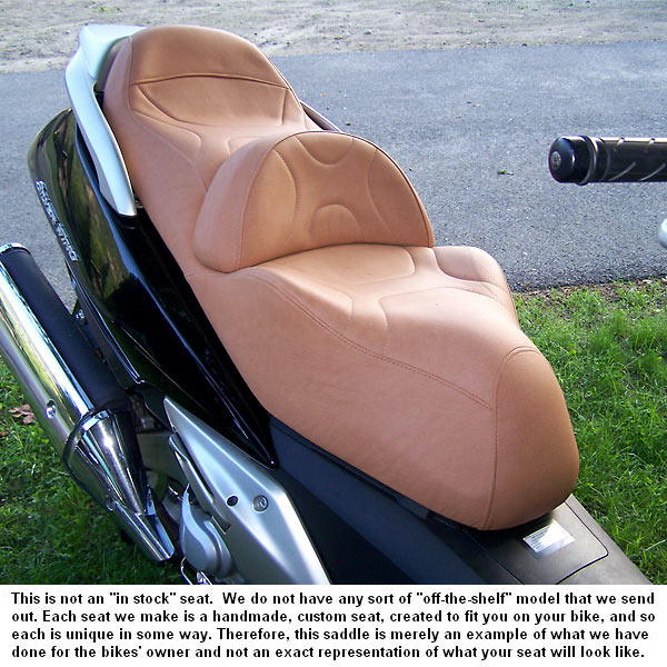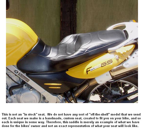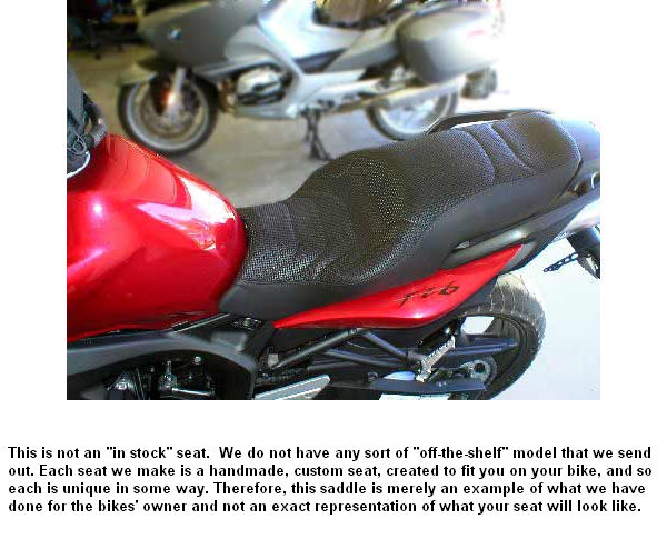| Photo Gallery Use the menu below to view these photos of saddles made by Rick Mayer Cycle. This page is constantly being updated as new photos become available. All image links will open in a new window (or tab). Close the image window to return here. Please be aware that we make seats for any bike imaginable. For the most part, the photos listed here are from our customers who send them to us, or they are photos taken in our shop at the completion of a ride-in appointment. We always put photos online as soon as we can. This gallery represents our available stock of photos. These are not "in stock" seats. Each seat we make is a handmade, custom seat, created to fit you on your bike, and so each is unique in some way. We do not have any sort of "off-the-shelf" model that we send out. Therefore, these photos are merely examples of what we have done for the bikes' owners and not an exact representation of what your seat will look like. Note: Any seats described as "low" or "for the short rider" have been modified from stock to increase the customer's ground clearance. Please see our FAQ's (or contact Rick) for more information about this issue.